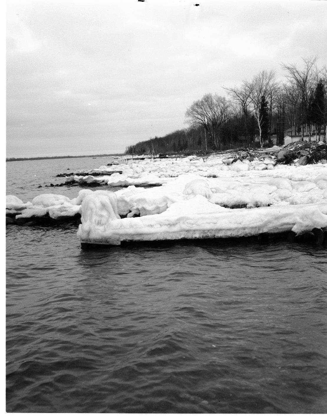 The shape of things to come, are these ice formations on docks and rocks in front of cottages at Victoria Harbour. Warmer weather and rain have removed the ice since the picture was taken, but it may not be long before there’s a permanent coating that will last several months until the spring thaws. (Scenic photos of our area were included in almost every edition of the Free Press and County Herald.)