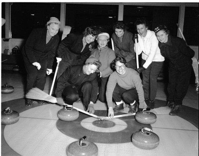 Long considered a man’s stronghold, curling rinks across the country now resound to urgings of “sweep” in feminine pitch most afternoons. The scene above was taken in Midland Curling rink as skips Mrs. Ray Trew, left, and Mrs. Charles Walton measures a couple of close ones. Other members awaiting the outcome in the back row are Mrs. Bruce Holt, Mrs. Dan Nicholls, Mrs. C. Paterson, Mrs. Jack Thompson, Mrs. Clive Park (Mary nee Patterson) and Mrs. Woodrow McConnell (Merza nee French).