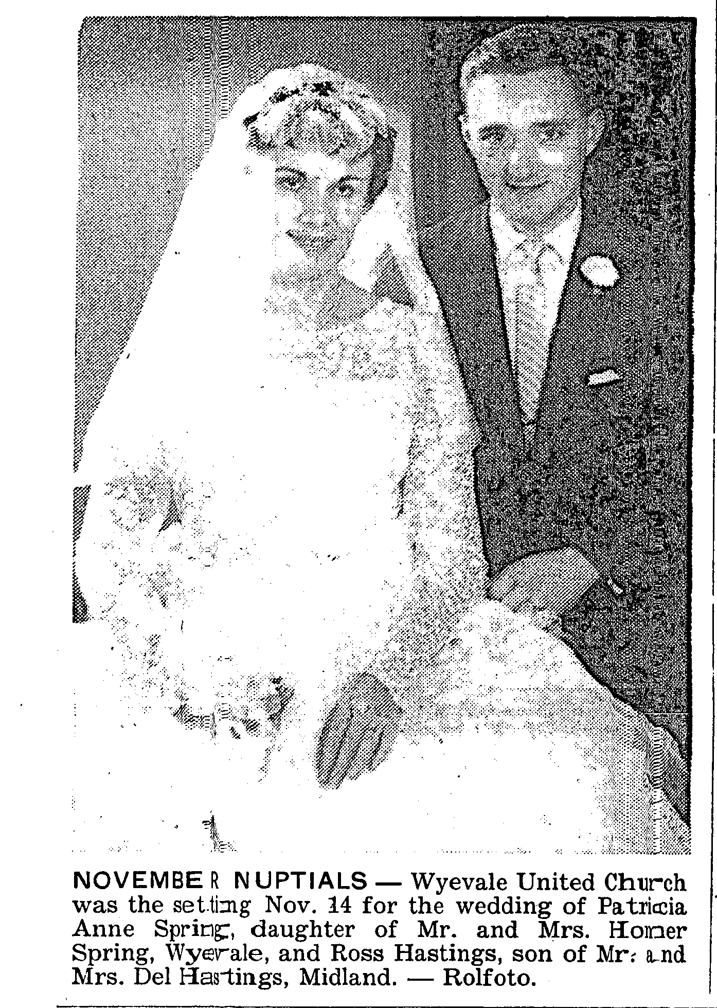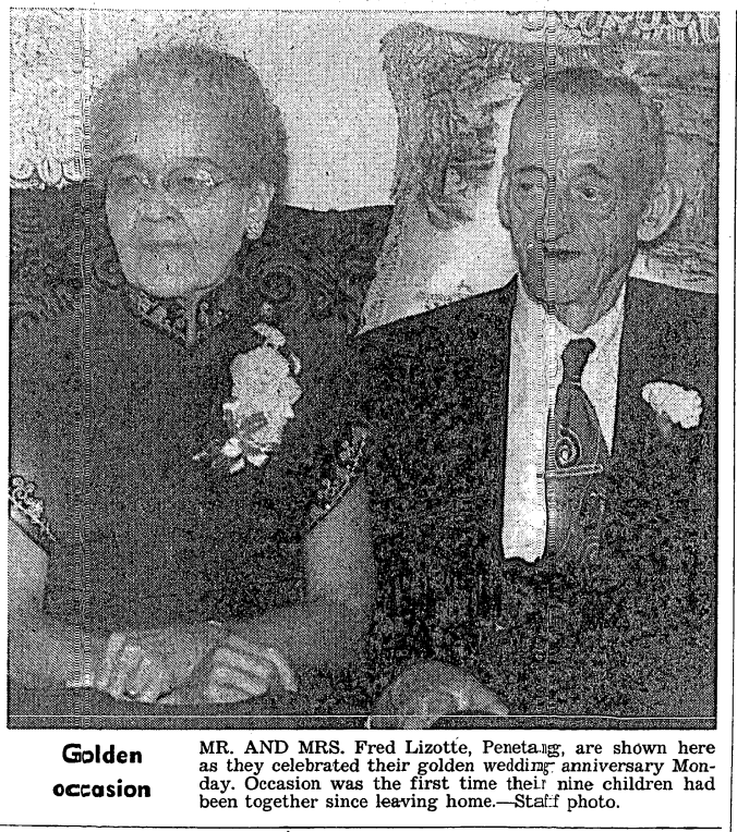 The dinner was held at the home of a daughter in Anten Mills. Mrs. Lizotte, the former Mary Longlade, has spent her entire lifetime of 70 years in Penetang where she was born. Her husband, Fred, was only a child when his family moved to Penetang from Mattan Quebec. He has lived in Penetang since that time. Although he was forced to retire some 20 years ago through ill health, Mr. Lizotte, now 74, vividly recalls days he spent working in the lumber mills around Penetang and Midland. He also worked at times in nearby lumber camps. He said while he was working in a lumber mill in Midland, he rode his bicycle to and from work, carrying noon lunch. There were no roads as we know them today, he said, and he speaks of cycling in and out among the trees to get to the mill. Mrs. Lizottte recalled seeing the first car owned in Penetang, and the day W. F. Beck first drove it down the town’s main street. Still talking about travelling, she said, we used to go to Honey Harbour once in a while, and that was a full day’s trip. The road to Honey Harbour was “just a path through the bush”, and the buggy had to be driven in and out among the trees. The couple’s anniversary actually occurred Monday. They celebrated it in their own Peel Street home where they had lived for the past forty years. The family gathered around them included their only son, Arthur, who is a constable on the Penetang Police force. (Gave me my only Penetang speeding ticket.) They have eight daughters; Mrs. M. Friedman, Mrs. M. Lacroix and Mrs. B. Ellsworth, Sarnia; Mrs. D. Ostertag, Orillia; Mrs. B. Fraser, Midland; Mrs. Frank Moreau, Anten Mills; Mrs. M. Duquette and Mrs. B. Lalonde, Penetang. There are 37 grandchildren and three great-grandchildren. “I wouldn’t mind living long enough to celebrate another 50 years of married life,” Mrs. Lizotte said as this reporter left.