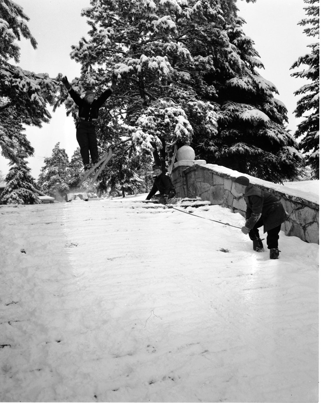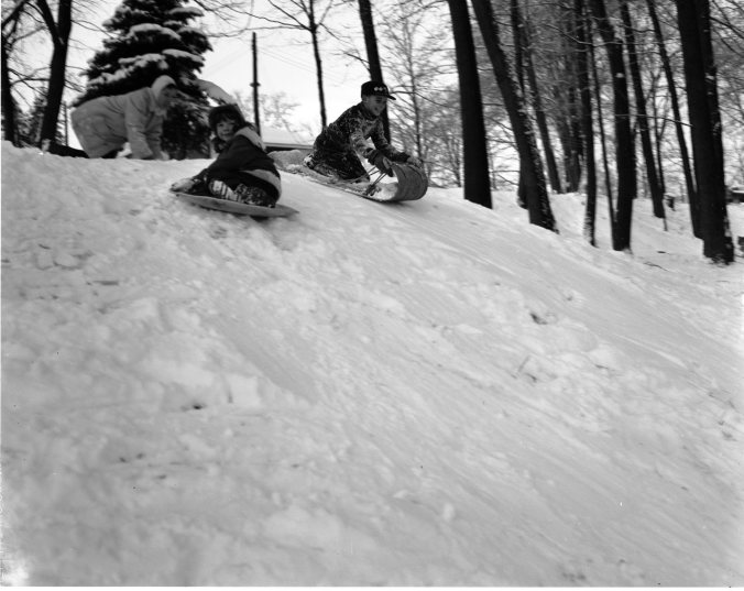 Local youngsters are most fortunate, in having wonderful facilities for winter sports right in Midland, at Little Lake Park. In this picture, Denis Abbott has rigged up his own ski jump, using one of the stone stairs as a “landing field”. Denis got 23 feet on this leap. In picture 6197, a Midland mother has just launched her small daughter on a “flying saucer” trip down one of the hills. Brother needed no help on his toboggan. There was also ice skating on the nearby lake for other kiddies.
