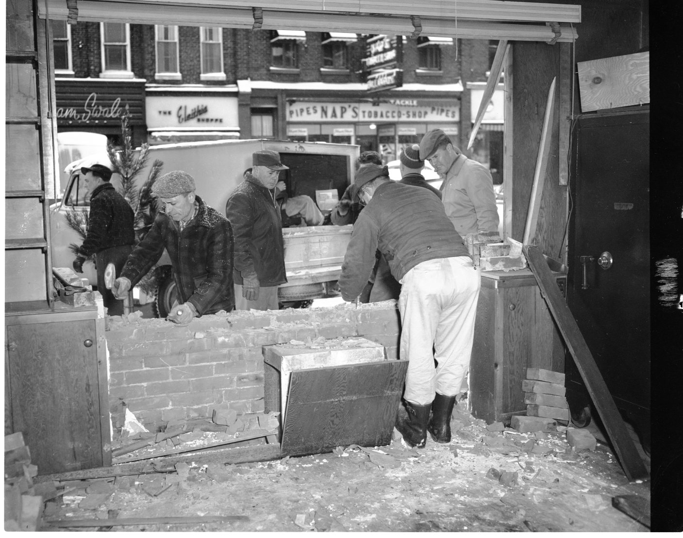 Employees of the Free Press Herald had an unobstructed if a somewhat chilly view of the stores across King Street when workmen removed most of the front wall last week. This was necessary in order to get many of the large presses out of the building into the commercial printing plant on Hugel Avenue. Replaced the next day, the large plate glass window eventually cracked under the strain.
