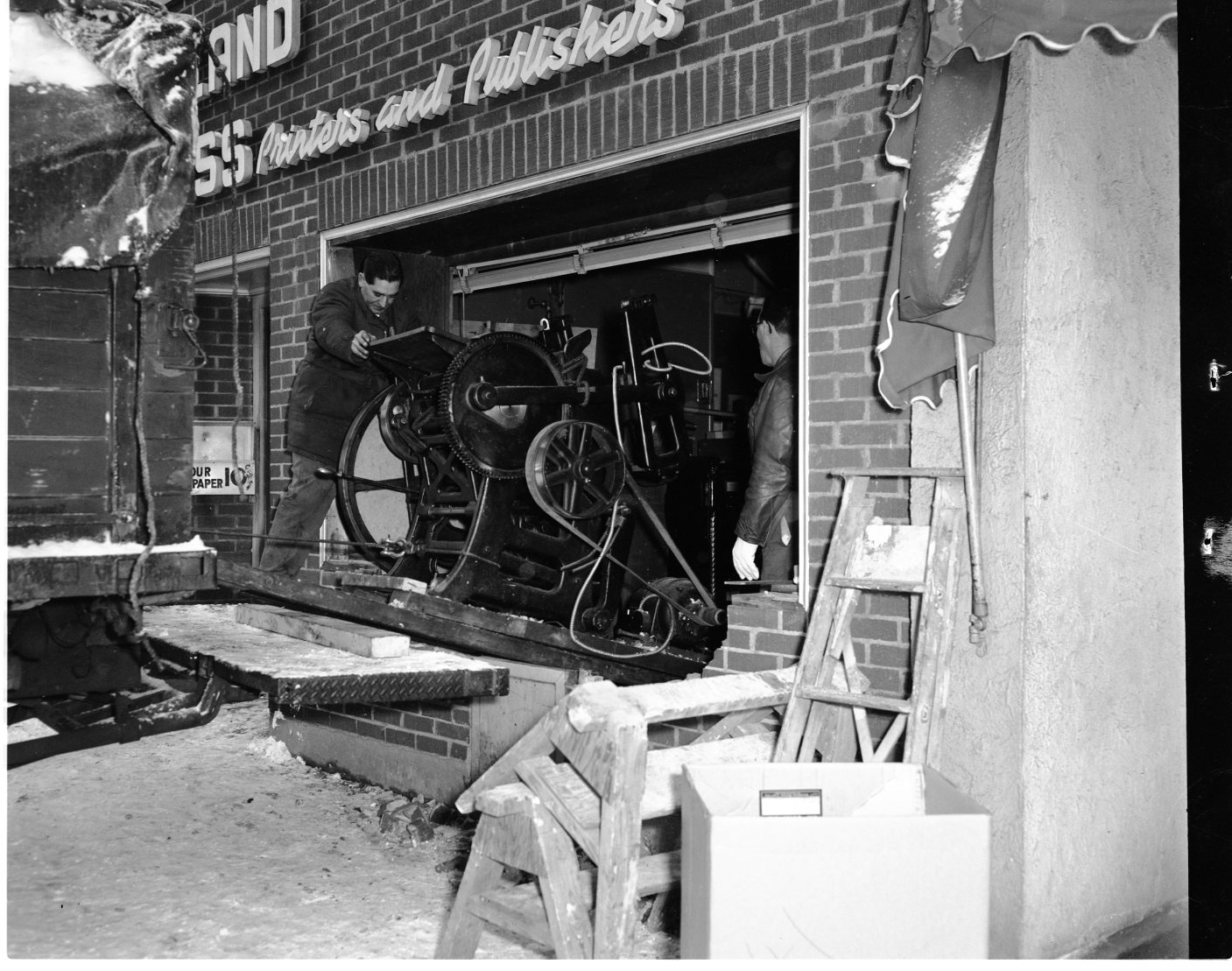 Operation shift was in full swing at Midland Printers Limited when this photo was taken last week. Here workmen steady the Gordon press as it is winched up skids onto the truck to be moved to the new commercial printing division quarters on Hugel Ave E. Most of the heavy equipment was moved in one day.