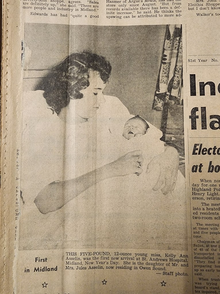 This five-pound, twelve-ounce young miss, Kelly Ann Asselin, was the first new arrival at St. Andrews Hospital New Year’s Day. She is the daughter of Mr. and Mrs. Jules Asselin, now residing in Owen Sound. (Original scan of article below)