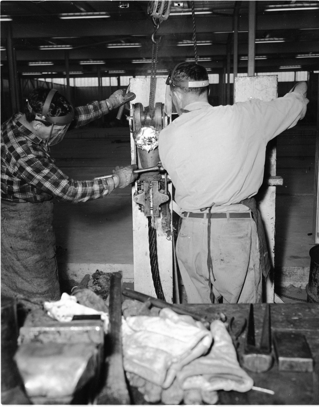 Good news for everyone in the Midland area, some 20 men are already at work in the new B. Greening Wire Company plant in Midland. Gil Hamelin (left) and John Fox are pouring the molten zinc which bonds the wire ropes securely into their sockets. Some 40,000 feet of such rope is being prepared here for use on three bridges in the Welland area.