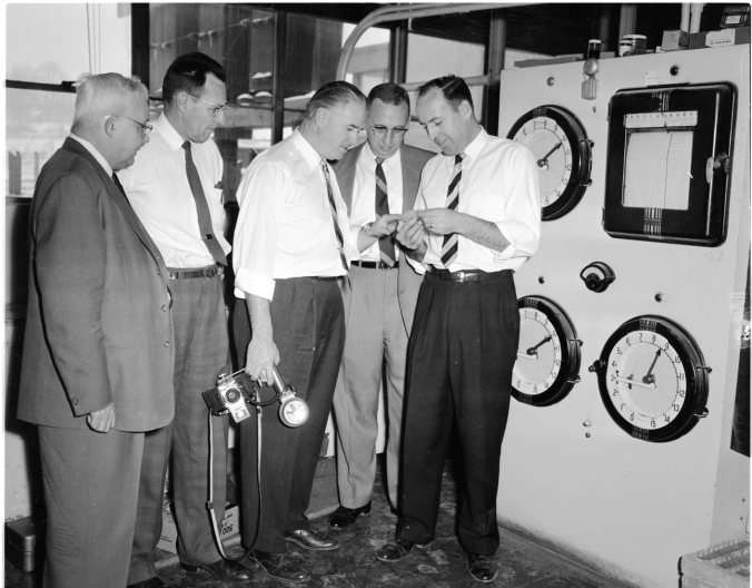 Manager of the Midland plant of Bausch and Lomb Optical Company Ltd., Larry Curran (right) explains the workings of a micromax control unit for fusing bifocals, to a group of B & L representatives who toured the plant Thursday.