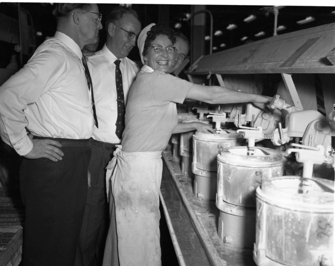 Some twenty general managers and sales managers of Bausch and Lomb Optical Company Ltd. toured the Midland plant Thursday. Miss Alice Brown operates a clear polishing machine for A. G. Parsons, North Bay manager (left) and J. T. Martin, Toronto. Partly hidden at right is Austin Upfold, Toronto branch manager.