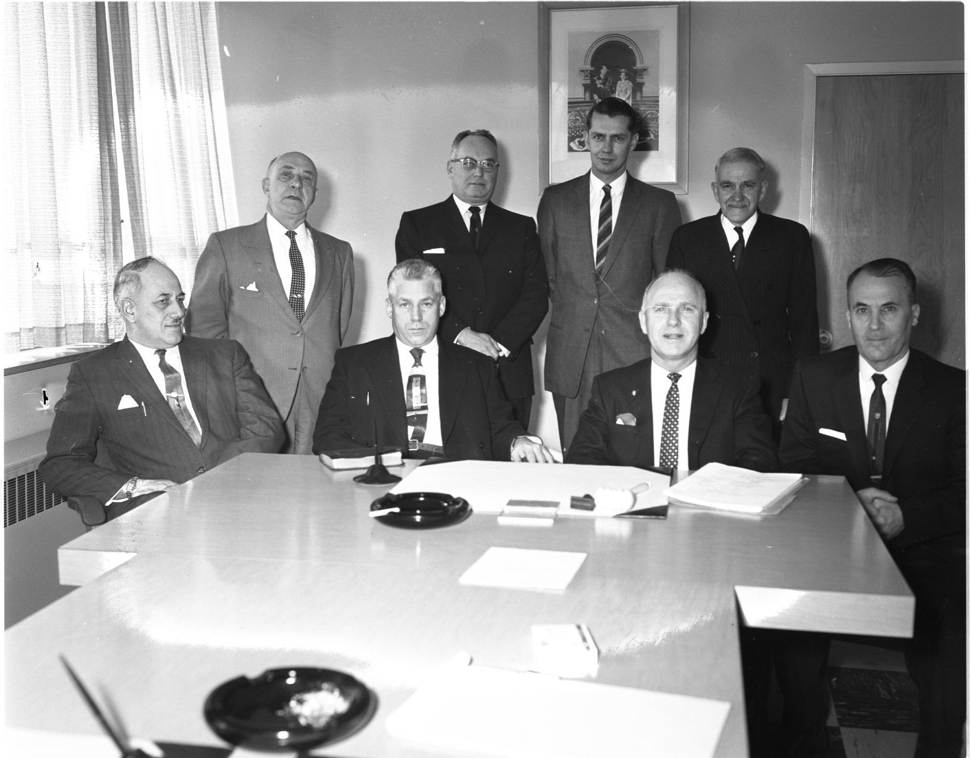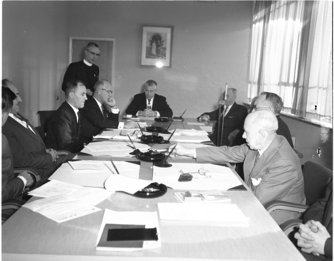 Devotional period, conducted by Rev. L. J. Delaney of St. Mark’s Anglican Church, was one of the features of the inaugural ceremonies of Midland’s 1960 council. Listening to Mr. Delaney’s address, clockwise around the table from left, are Alderman Doug Haig, Deputy-reeve Clinton Smith, Reeve Herb J. Beauchamp, Clerk William “Bill” Hack, Mayor Charles Parker, George S. Dudley Q.C., aldermen Percy Crawford, Bill Orr and James Mackie.