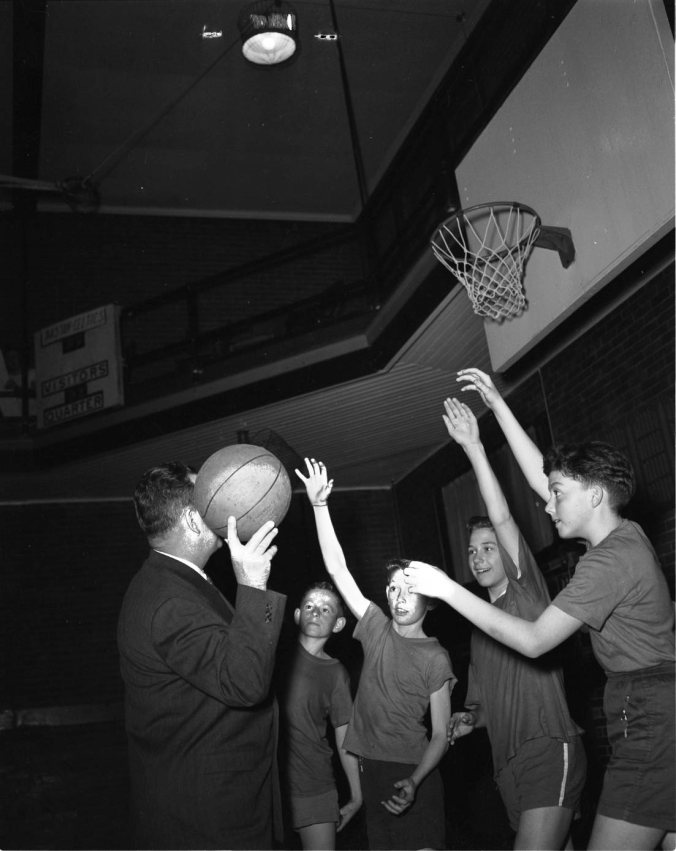 Little league basketballers at the ‘Y’, John Thomas, Tom Gordanier, Lawrie Thomas, Jerry Beteau and Morley Bath kibitz with sports director Lloyd Stackhouse as Mr. Stackhouse gives them a few pointers. The little league cage games were introduced at the Midland ‘Y’ a week or so ago.