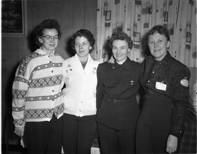 In the first spiel of the season held by Midland Ladies Curling Club January 6, a novice rink skipped by Mrs. Godfrey Trilsbeck of Penetang sprung a surprise by winning one of the top prizes. They are left to right, Mrs. Walter Spearn, Mrs. Orval Ambeau, Mrs. Len Carter and Mrs. Trilsbeck, with Mrs. Norman Greene, chairman of the bonspiel committee.