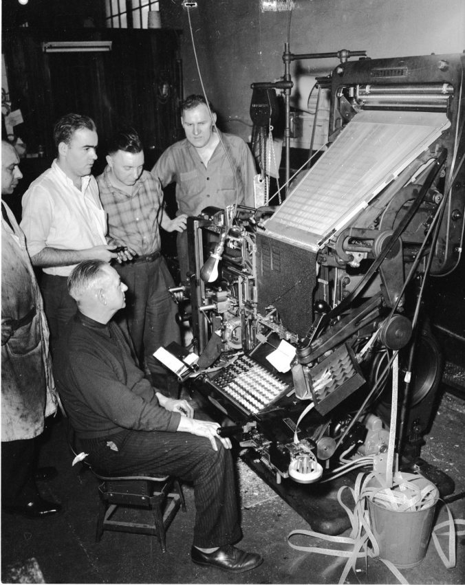 This new intertype machine in the Free Press plant features automatic type-setting equipment which handles teletype tapes as well as manual operation. Seated in front of the machine is veteran operator Frank VanStone. Grouped around, left to right; are Bob Goodall of the Intertype Company, Jack Jorna, Clare Holden and Bill Murphy.