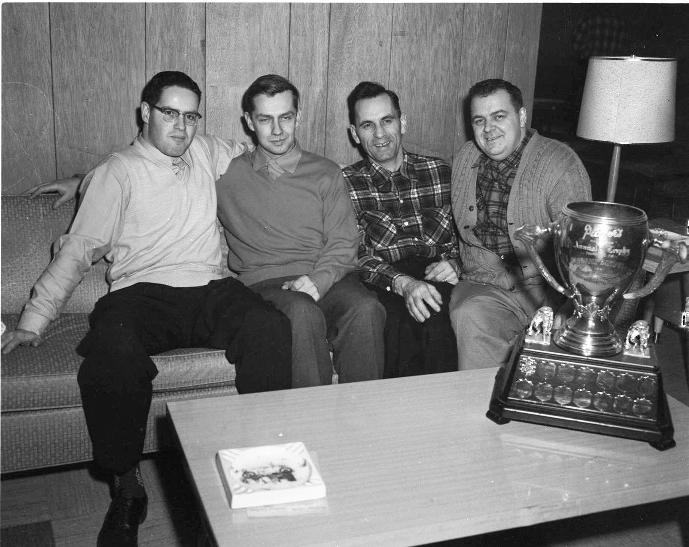 Winners of one of the major prizes at Midland Rotary Club’s second annual bonspiel was this rink from the Y’s Men’s Club, skipped by Doug Haig. Left to right are; Bill Russell, Mr. Haig, Bert Banting and Clive Park. Incidentally, they DIDN’T win the cup at the right, the photographer learned later.