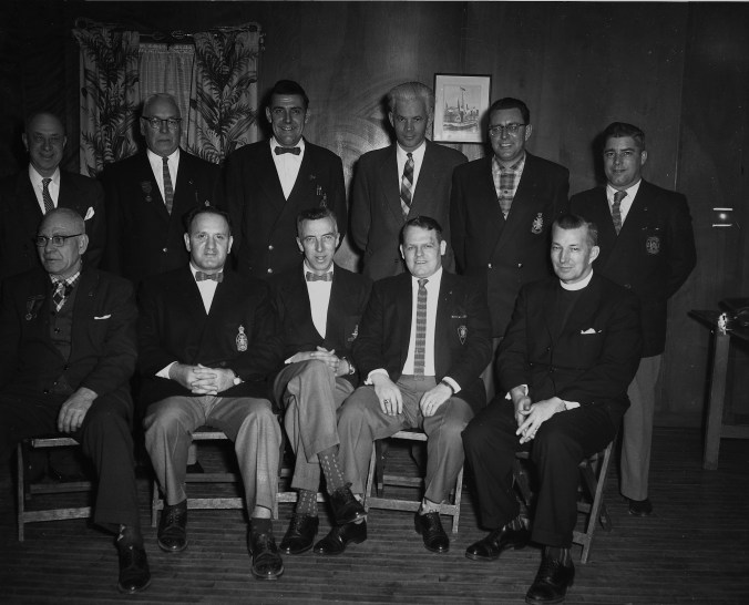 Officials of Branch 80, Canadian Legion, Midland, for 1960, were inducted into office at a meeting in the Legion Hall January 13. Left to right are, front row, H. A. Wiles, secretary; Saul DeVries, 2nd vice-president; Borden Parker, president; George McLaughlin, 1st vice-president; Rev. J. L. Self, padre. Back row are James Mackie, Len Wiles, Oliver Lesperance, Ken G. Williams, Gene Lalonde and James Duncan. Mr. Wiles is the sergeant-at-arms and the others are members of the executive.