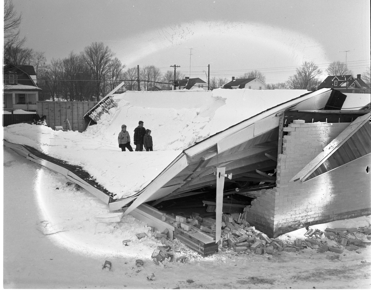Click on photos to enlargeHeavy snow on the roof was blamed for the collapse of a multi-car garage at Parkview Terrace apartments, Hugel and Seventh Streets, Midland, Friday morning. Fortunately, there was only one car in the garage at the time. Although not deep, the snow was ice packed following recent thaws and freezings.