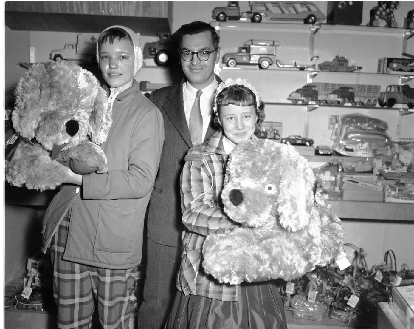 Two Midland school girls were the winners of these huge, plush shaggy dogs as a result of a contest sponsored by Edwards Specialty Shop Ltd. recently. Seen with Jim Hamer, manager of the basement store, they are Elke Krueger, 382 Manley Street, left, and Audrey Clarke, 94 Hanley Street.