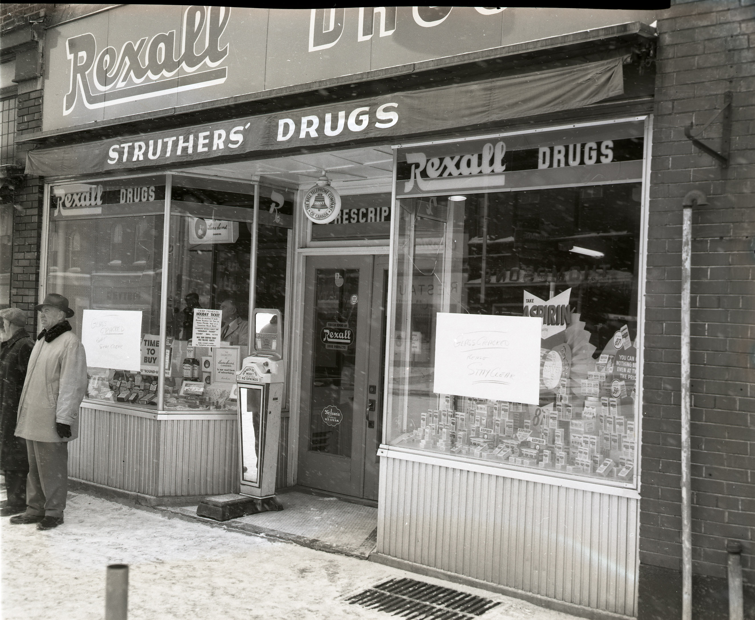 The intense heat generated by the fire at Peoples Store on King Street Friday March 4 cracked windows in stores across the street almost 70 feet away.  Windows in Struthers Drugs shown here and Cross Country Store had to be replaced.