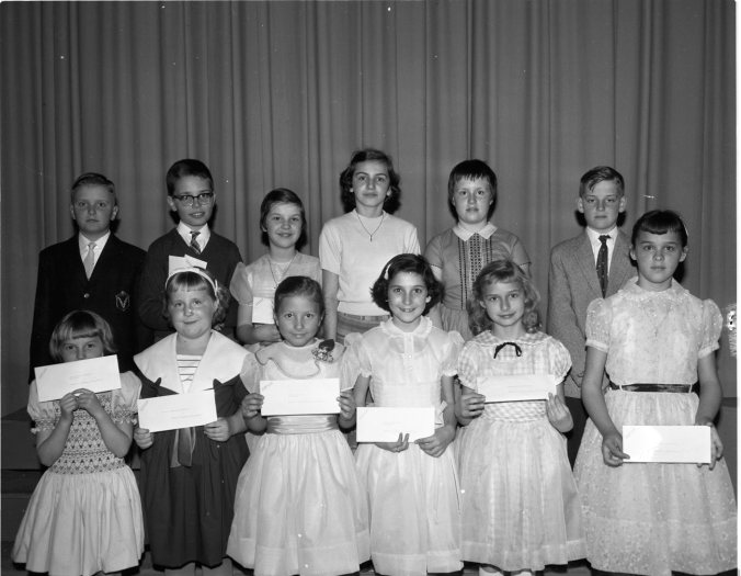 Some of the very youngest winners of scholarships at this year’s Midland Y’s Men’s Club music festival are shown following the concert at MPDHS auditorium. In the group left to right are, front row, Anne Cleaver, Gwen Duggan, Ruth Davidson, Mary Morden, Mary Lea Rutherford, Yvette Lortie; back row, Milan Borysek, John Svoboda, Linda Desroches, Theresa Martin, Jay Ellis and Michael Lefaive.