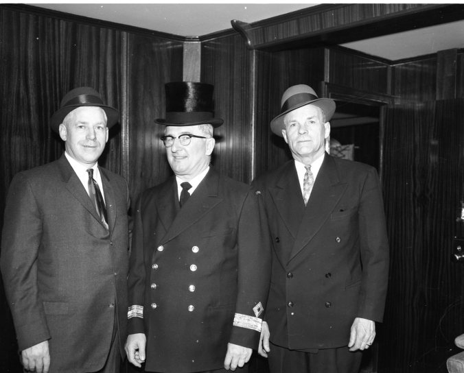 Midland harbour sprang to life again on the weekend with the arrival of seven grain boats. The top hat went to Capt. A. R. Rafuse of Cornwall, who brought 672,000 bushels of grain to Tiffin elevator on the Scott Misener. Seen above with Mayor Charles Parker, left, and Albert Hill, Tiffin superintendent, Capt. Rafuse had won another “hat” at Midland back in 1947. He started sailing when he was 15 years old and has been at it for 42 years.