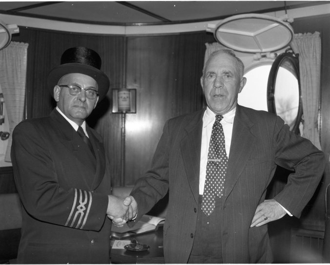 A familiar scene was re-enacted at Port McNicoll Saturday as Harbourmaster Alex McCullagh, right, presented traditional “topper” to Capt. J. W. Lenckie. The Wiarton skipper brought the first cargo of the season to Port, 642,000 bushels, on the John O. McKellar. Capt. Lenckie also won a hat for opening the season at Prescott last year.