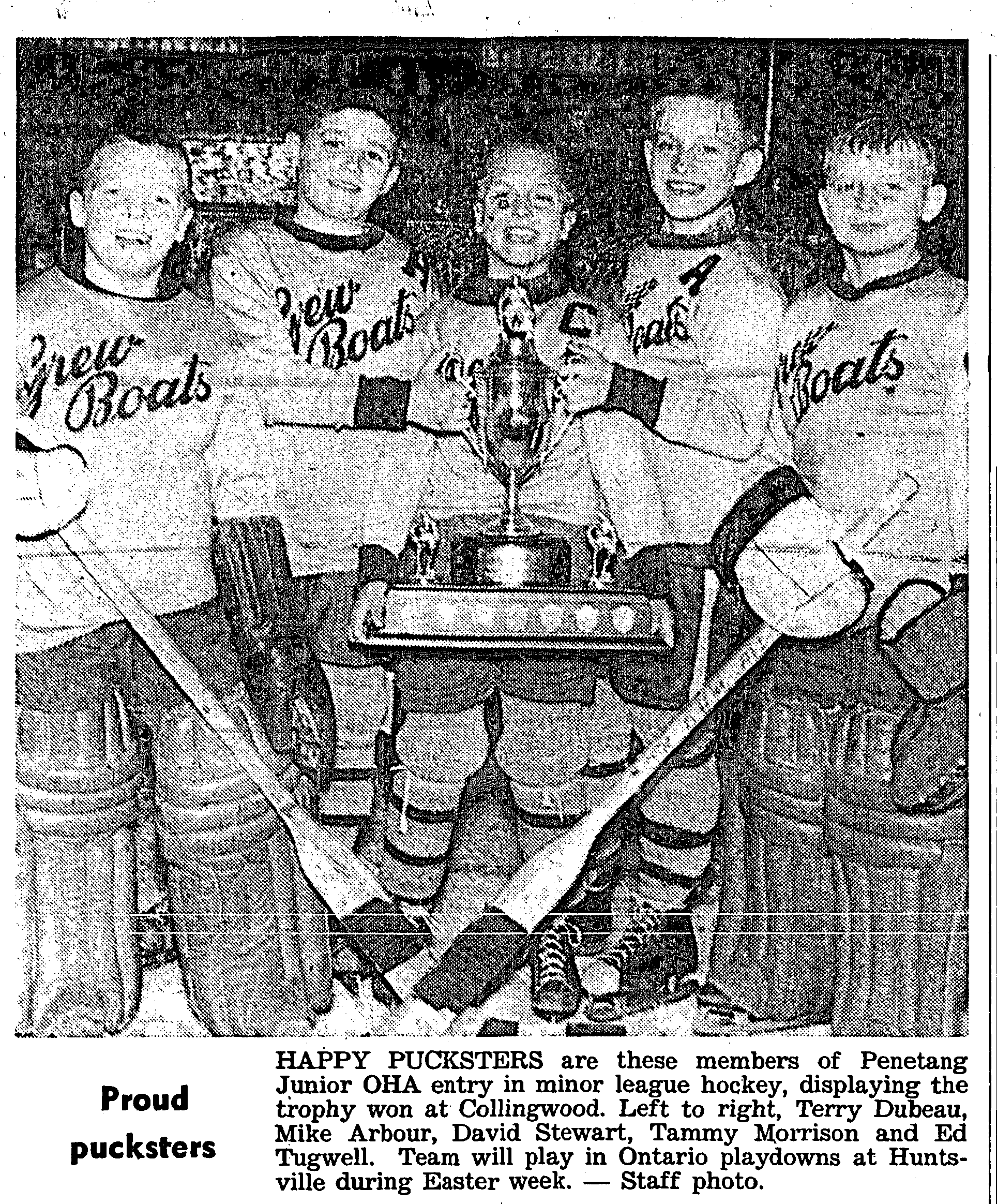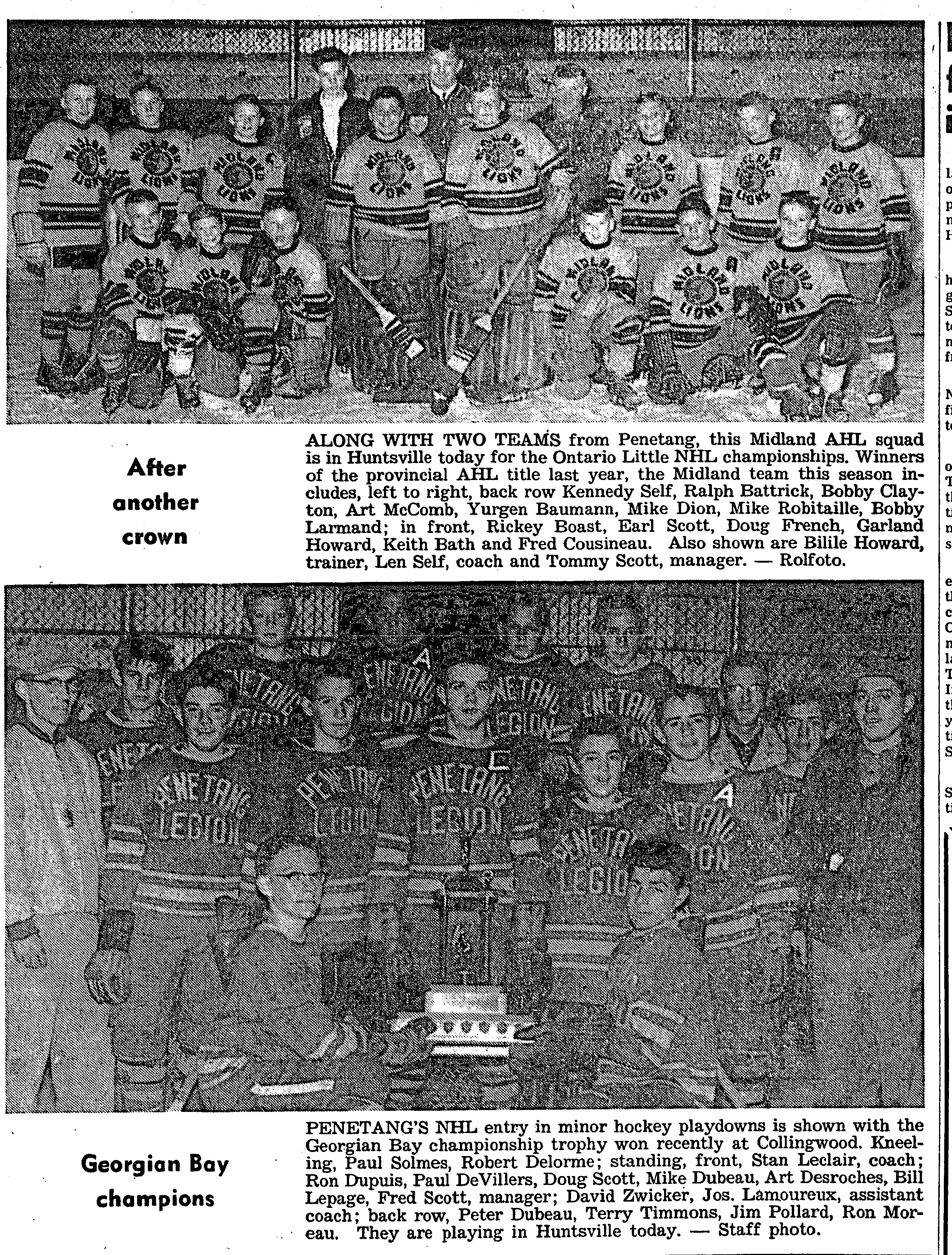 Fine weather on the Easter weekend nearly brought disaster to two Midland youngsters, for whom the lure of open water proved too strong. Rescued from a raft in the middle of Little Lake were Douglas Woods, 11, of 101 Bay Street, and Fred Maheu 12, 236 Sixth Street. Police said they were notified that the boys were in trouble on the lake around 12.30 noon Monday. The water in mid-lake was quite rough at the time. By the time police arrived, Bert Smith and Richard Ivans of Smith’s Camp had gone out in a boat and picked up the boys, soaked and frightened off the raft.