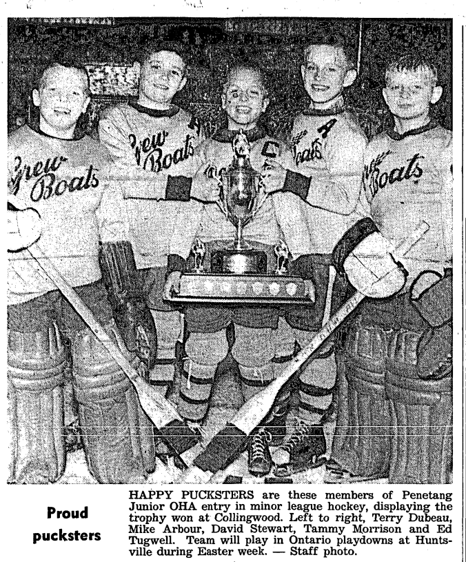 A lengthy Illness in St. Joseph’s Hospital, Toronto, ended in death for Andy Bellehumeur, Tuesday, April 12. He was in his 57th year. A native of Penetang, Andy Bellehumeur was one of the town’s sportsmen who made a name for himself in the world of hockey, both professional and amateur. In hockey circles, he has always been known as Andy Belemer, and it said this resulted from his first team berth away from his home town. While playing hockey for New Hamburg, a town settled predominantly by German Immigrants, his family name was shortened to provide easier pronunciation for the fans, and easier writing for the sports reporters. His first jaunt into the big time came when he went to the Windsor Bulldogs at the start of the 1928-29 season where be became a star defenceman. He played for that team through a total of seven seasons. From Windsor, he went to Montreal Maroons of the NHL for two months, and from there went to play in a number of American cities, including Cleveland, Syracuse, Rochester, Kansas City, Tulsa and Dallas. As his playing days drew to a close, Andy turned to refereeing and spent 15 years officiating in OHA circuits. In his capacity as an official, he was highly regarded by players and management. Prior to returning to Windsor Bulldogs as head coach for the 1958-59 season. Andy piloted the Junior “B” club at Parry Sound for two years. When ill health struck at the beginning of the hockey season just over, he was appointed manager of the Bulldogs. Andy’s last official appearance in Penetang was at the opening of the arena two years ago, when he dropped the puck for an exhibition hockey game between Barrie Flyers and Toronto Marlboro’s. For the past 15 years, Andy had lived in Bala where he owned a restaurant. The late sportsman was buried in Windsor, where he had spent the greater part of his hockey-playing days, Saturday morning. A number of relatives from this area went to Windsor for the funeral. He is survived by his wife, Helen, and five brothers, Phil and Fred of Windsor, Harvey, Midland, Edward, Penetang and Arsene, New Orleans.
