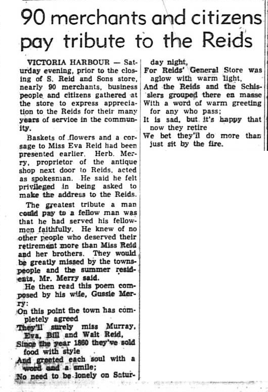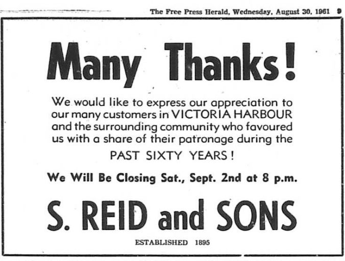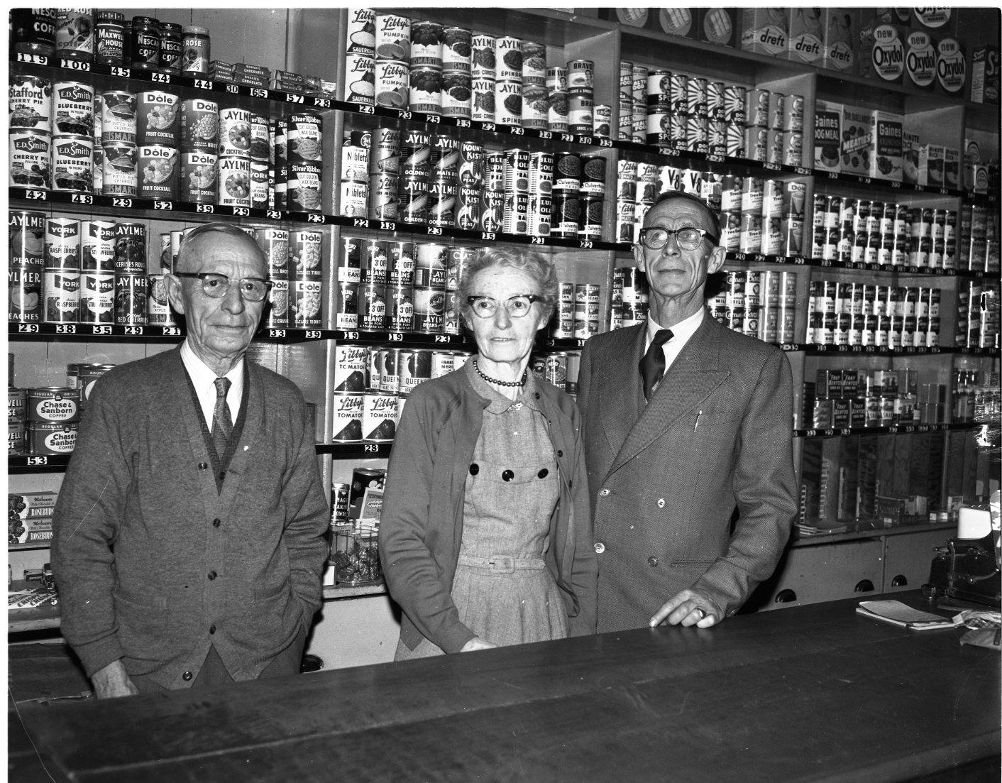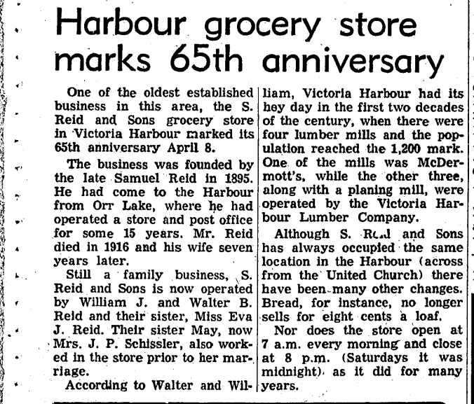 Truly a family business is the S. Reid and Sons grocery at Victoria Harbour. Founded by the late Samuel Reid 65 years ago, the store is still run by his sons, William, left, and Walter, and daughter Miss Eva J. Reid. The store has been in continuous operation on the same site since April 8, 1895.