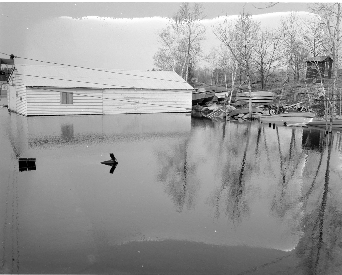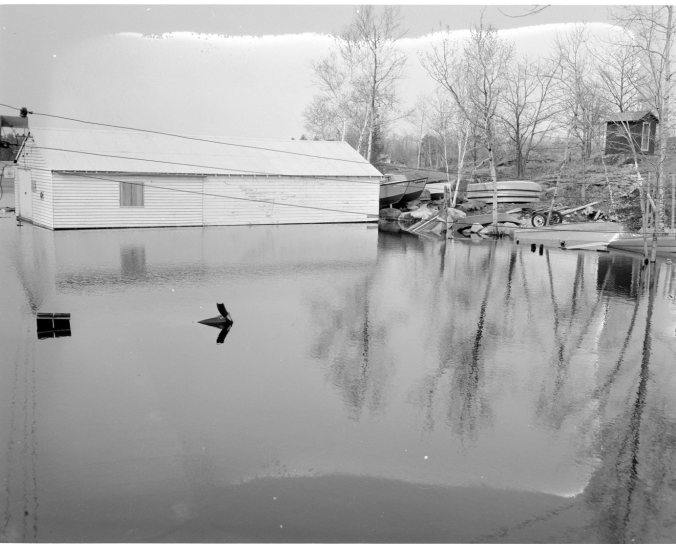 Getting into this boat house at Six Mile Lake may be quite a problem for some time, unless the unusually high waters recede quickly. Although it doesn’t show, there’s a dock running along the left side of this picture to the boat house door. It’s covered by more than a foot of water. Level of the lake is governed by the level of the nearby Severn River.