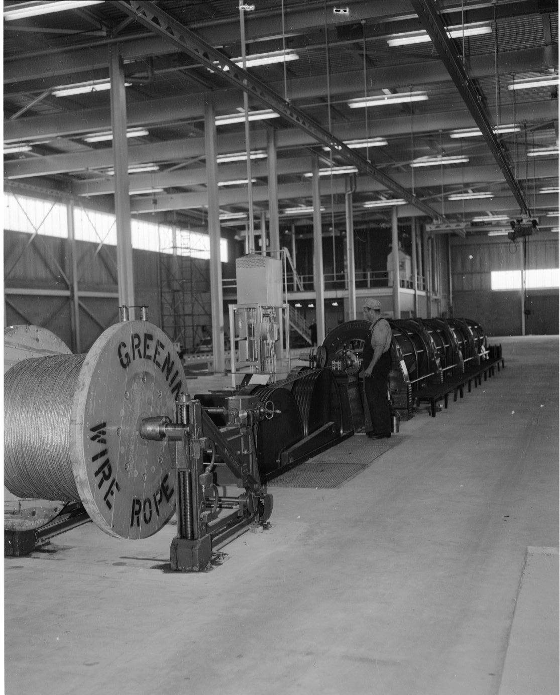 To persons not acquainted with the manufacture of wire rope, this machine turns out the finished product in startling fashion, weaving a number of strands around one central wire core. Attending the machine, in Midland’s new Greening Wire plant, is Mike Fox, one of about a dozen local men now steadily employed.