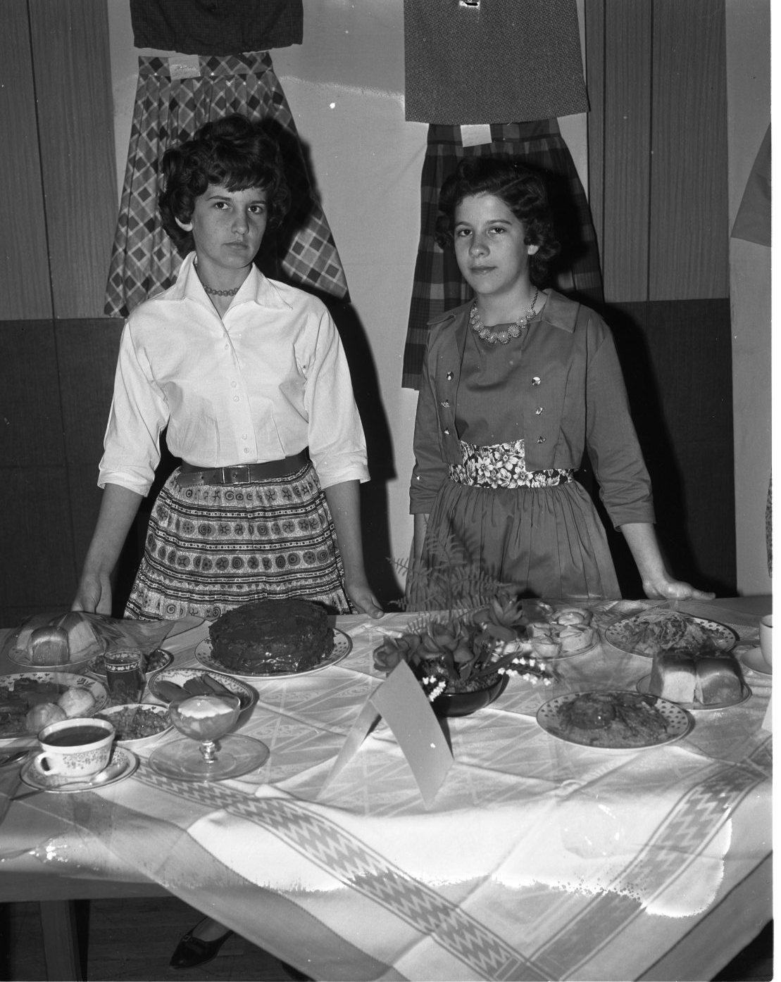 Pupils of Port McNicoll Public School and their teachers held open house for parents Tuesday night in the school. Here Patsy Kelly and Judy Coughlin stand behind a table laden with some of the works of art of student cooks. On the wall behind them are skirts made by girls in the home economics class.