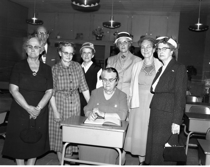 Among the “Old Timers” who attended the opening of the new wing at Mountain School April 6 were the women, and one gentleman, above, watching Mrs. Bertha Clark McQuay of Midland sign the guest book. Mrs. McQuay was the oldest graduate of the old red school present. Others are, left to right, Mrs. William Wallace, Midland, Fred Toole, Toronto, Miss Dorothy Bennett and Miss Mary Bennett, who still reside on the “mountain”, Mrs. M. Leatherdale, Midland, Mrs. Annie VanCamp, Balm Beach, and Mrs. Ethel Bateson MacMillan, Midland.