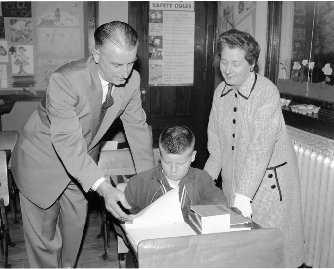 Mr. & Mrs. Bert Armstrong seem proud of the work done by their son, Bobbie (Bob Armstrong), a pupil at Port McNicoll Public School. The school held open house for parents Tuesday night. The annual event attracted a good crowd. Also on display were articles made by the woodworking class.