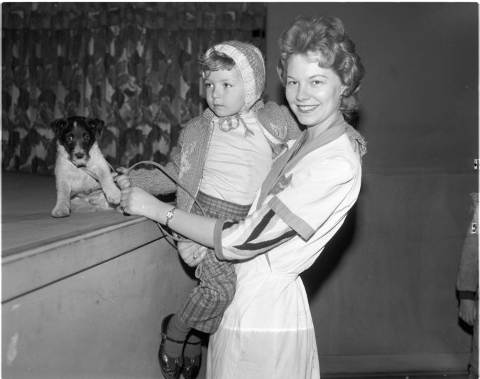 “I sure hope Toby wins a prize,” says little Carol Willett, three-year-old daughter of Mr. and Mrs. Ross Willett, as they wait for the judges’ decision at the dog show held at the Roxy Theatre recently. Lending moral support to Carol (and Toby) is Roxy attendant Sharon McElroy.