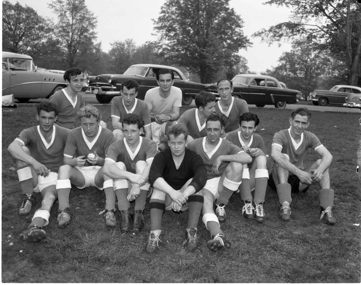 Seen during the half-time interval, Midland Huronias defeated Orillia 5-1 in Midland Saturday in the opening soccer game of the season. Left to right, members of the team are, front row — Wally Meisinger, Herman Härtung, Wolfgang Gieseler, Sandor Szigeti, Wolfgang Jaenisch, Joe Foitzik, Pete Van- DerVelden; back row — Karl Lehr, Eugen Engelsberger, Willi Schwartz, Bill Rittershofer, Hank Van Dervelden.