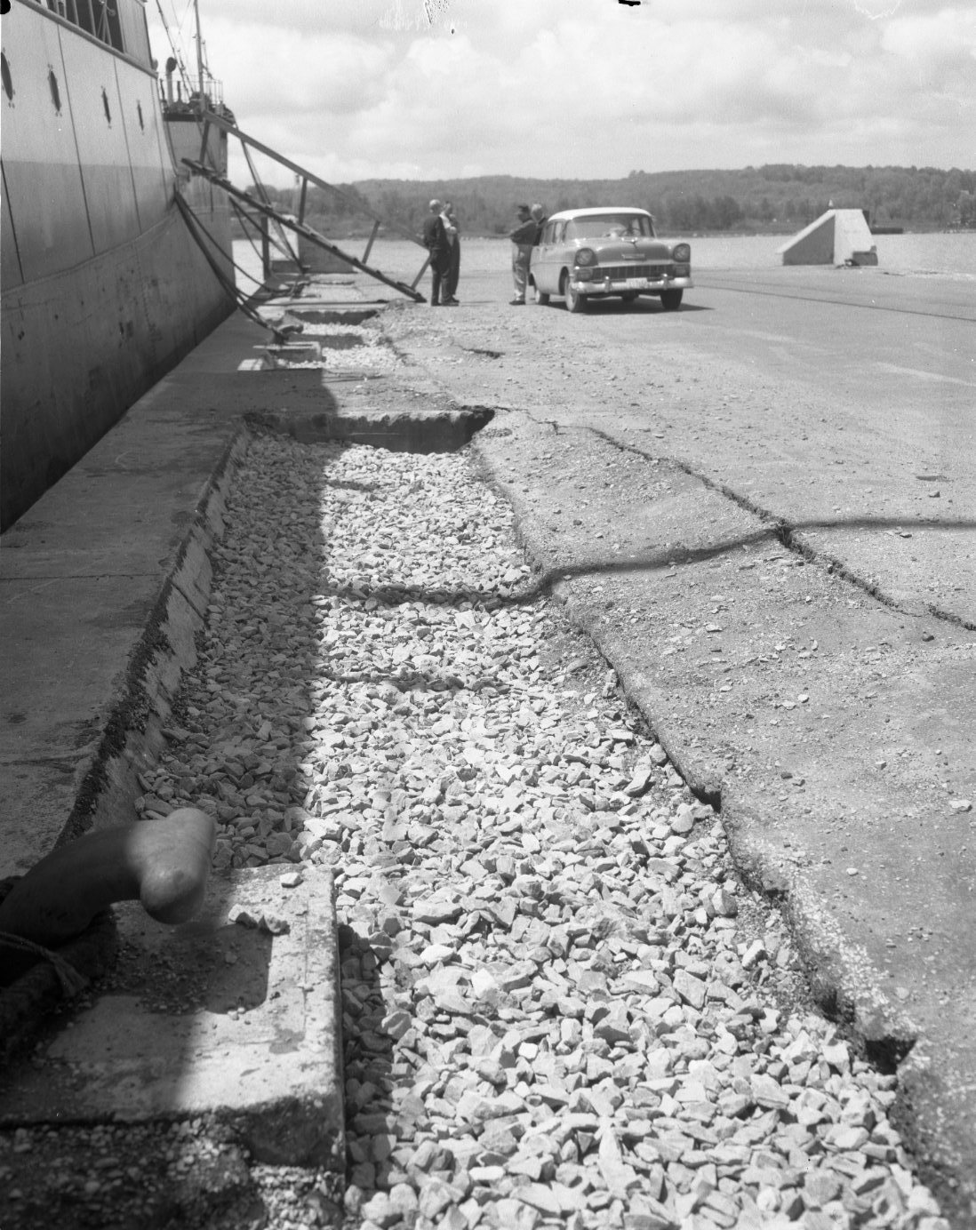 Officials are having their worries at Pier “A” in Midland harbor, where the fill along both edges of the dock keeps sinking, taking with it the new tarmac surface. The area was filled with crush stone (at left of picture) some weeks ago, but another large crack has opened up some four feet to the right of the gravel.