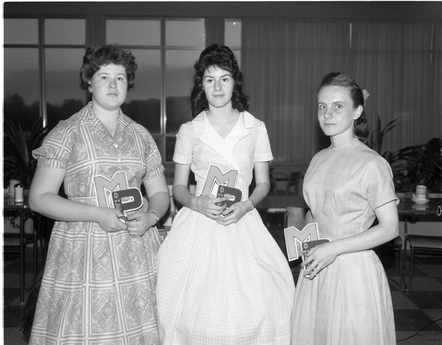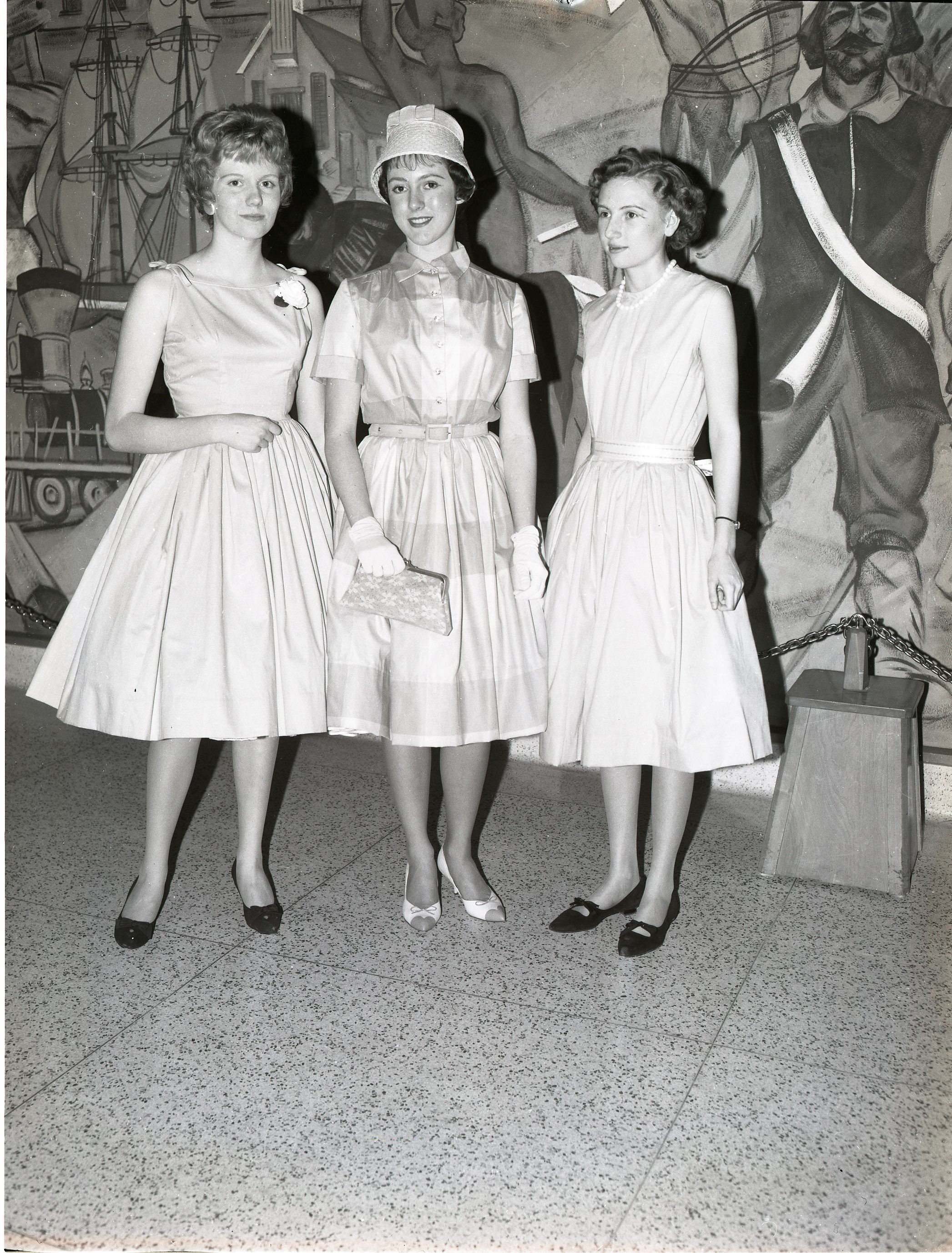 These girls have reason to be proud of the dresses they made for themselves and displayed at MPDHS “School Days” fashion show last week. Left to right are Wendy Feltham, Bonnie Brisebois and Carol Dexter, Wendy and Carol made sun dresses and Bonnie a shirt-maker dress.