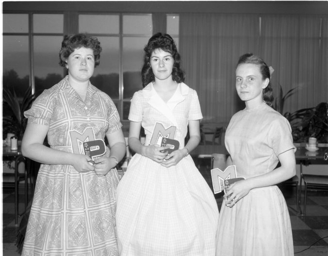 Pictured are three of the four girls who won their letters as members of MPDHS track and field teams this year. Left to right are; Elaine Binkley, Junia Corcoran and Thelma Penhale. Other winner, not present when the picture was taken following the MPDHS athletic banquet Wednesday, was June Montgomery.
