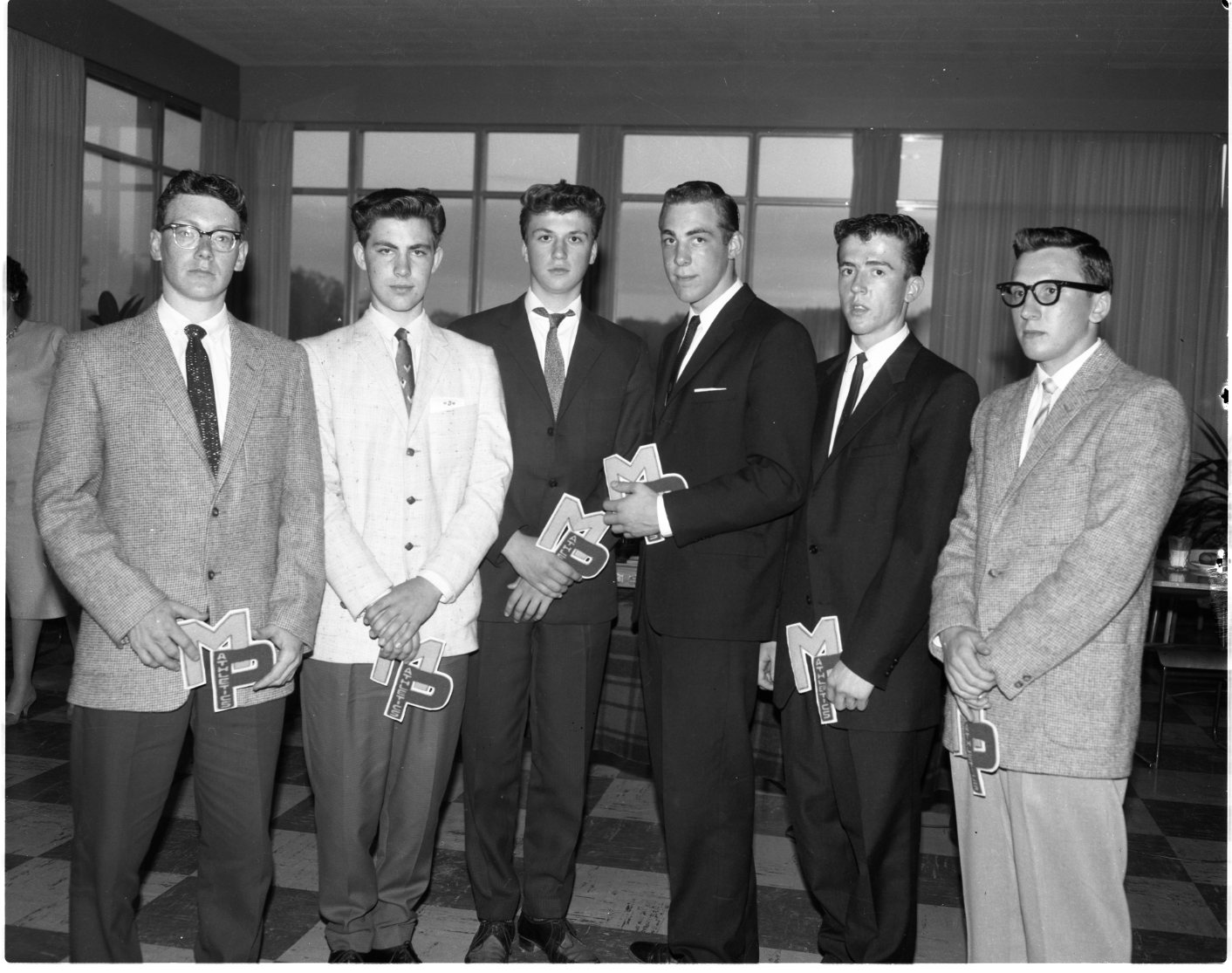 Winning their “letter” is still a big achievement for young athletes, whether of high school or college ranks. These lads were given their “MP’s” at the annual MPDHS athletic banquet Wednesday. Left to right are; John Kingsborough, David Stainton, Ingo Hildebrand, Ben Archer, John Dion and Rodney Rankin. Another winner, Bill Swann, was not present when the picture was taken.