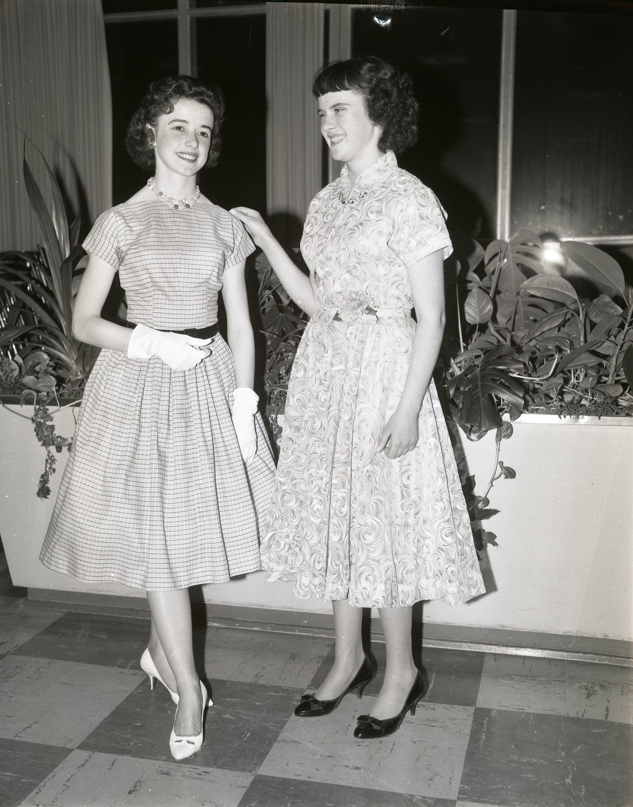 Waiting their turn to display their dresses at the “School Days” fashion show held at Midland-Penetang District High School auditorium Thursday night are Ann Sweet, left, and Sandra Curry.