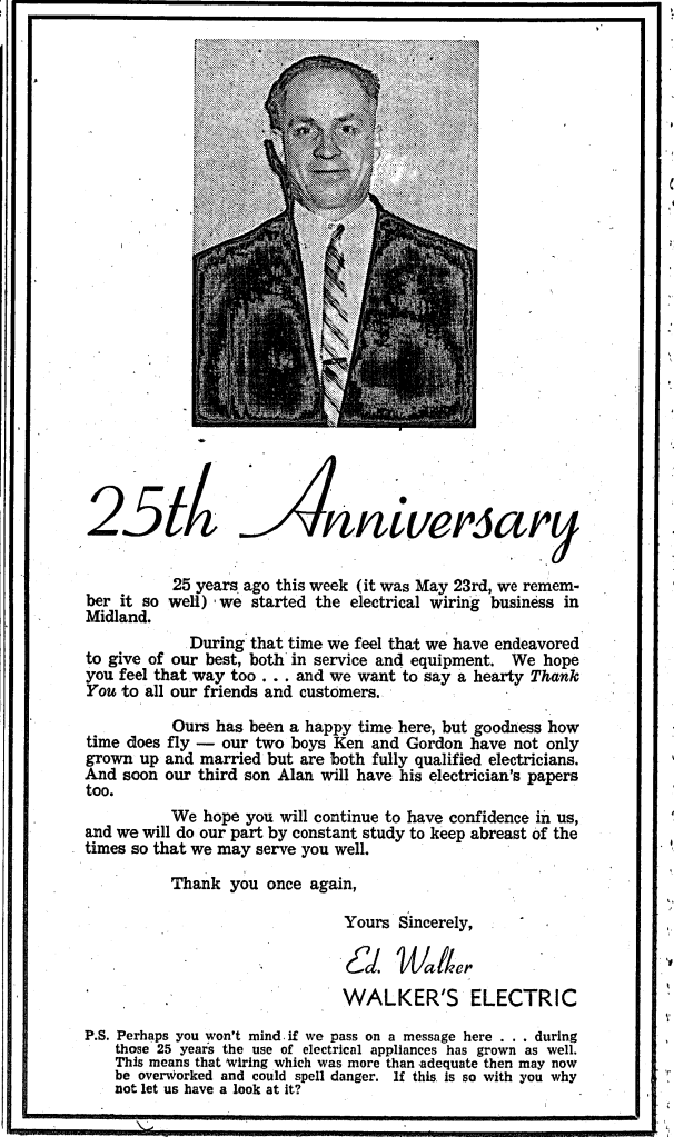 Twenty-five years can bring about a good many changes, as Midland electrical contractor Ed Walker can well attest. On May 23, Walker’s electric celebrated a quarter century of business association in Midland. According to Mr. Walker, they have been 25 very happy and fruitful years. When Mr. and Mrs. Walker came to Midland in 1935, their son Ken was one year old. Today they are the proud parents of six children and the grandparents of three grandchildren. Mr. Walker feels Midland is an excellent community and says he has enjoyed his business and social relationships in the town. So, apparently, do three of his sons, for they have joined their father in the electrical contracting business. Now working with the firm are Kenneth, Gordon and Alan. Ed, is a past president of Midland Lions Club, and a past deputy district governor of Lions International. He has taken a keen interest in the Lions Club public speaking competitions held annually. As well he is a member of Caledonian Masonic Lodge and has served as an elder of St. Paul’s United Church. (Mr. Walker died in February of 2009, in his 98th year.)