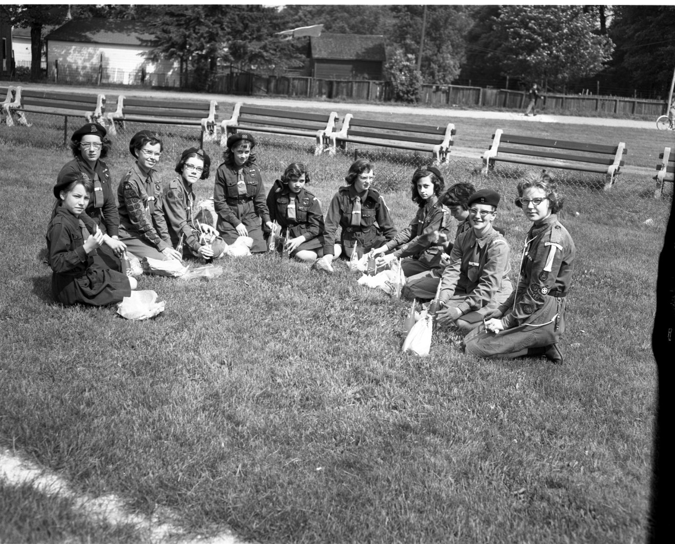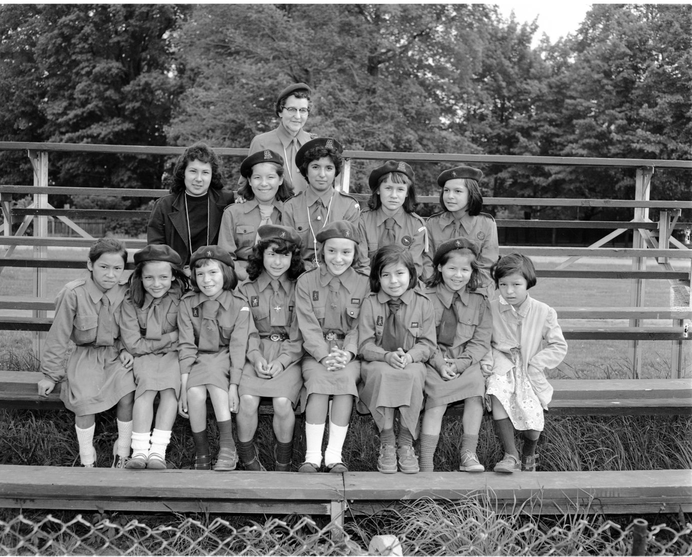 One group which attracted a lot of interest at the Guide and Brownie rally in Midland Saturday were these Indian lassies from Christian Island Reserve (now Beausoleil First Nation). Seen with their leader, Miss Lillian Hawkins (rear), the troop was formed six years ago. The Guides are known as the Blue Canary and Rose troop, while the Brownies are the “little people, fairies and gnomes”. (Identification thanks to Myrtle Jamieson – Top row; Winnie Hawke, Cynthia Jamieson, Donna, Edie, and Cheryl. Bottom Row, Bonnie, Joanne Flontek, Myrtle Jamieson, Betty, Mary Hawke (Norton), Joyce (Monague) Solomon, ? can’t recognize and Carol (Kal) Monague. (We would appreciate filling in the missing names?)