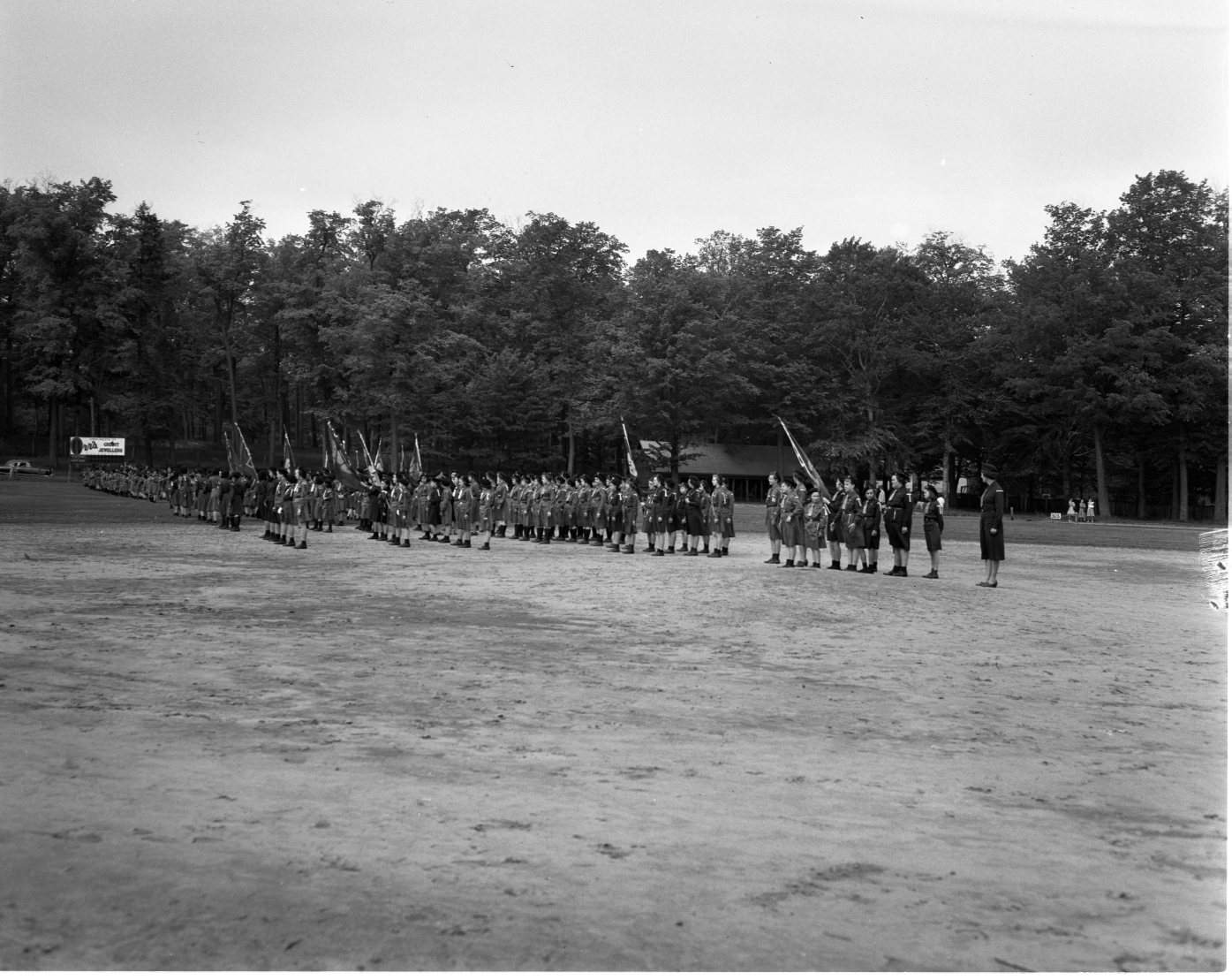 Lined up for review, when this photo was taken, were hundreds of Guides and Brownies from North Simcoe and Parry Sound areas. The rally formed part of the 50th anniversary celebrations of the Guide and Brownie movement.