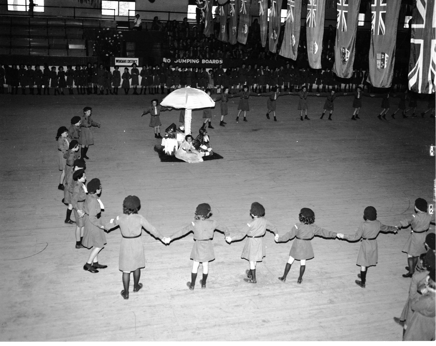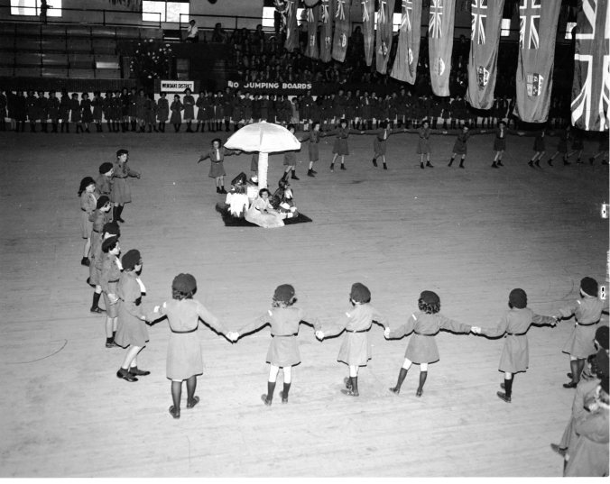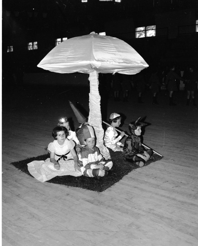 Seated under their giant toadstool, Brownies from Wendake District packs solemnly depict a fairy, sprite, elf, gnome, pixie, and little people on the Arena Gardens floor, included in the fairy ring are Elizabeth Robitaille, Norma Clarke, Melanie Dyer, Mary Jane Cavanaugh, Bonnie Solmes and Vivian Lacroix.