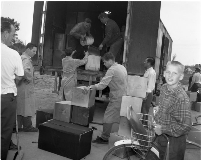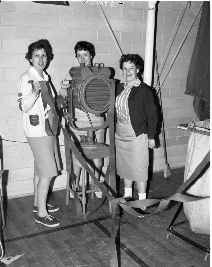 Three pretty “sailors” trying their hand with the Aldis lamp are, left to right, Marion Lavigne, Pat Playford and Linda Stewart. Girls were helping to set up the MPDHS gym for the annual prom, themed this year on a “Cruise to Italy”.