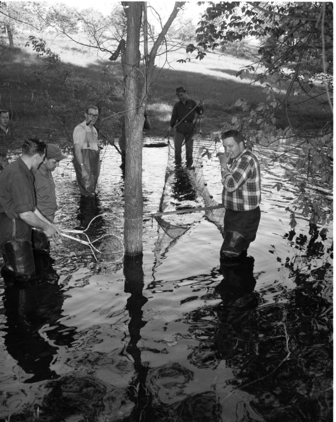No need to call the police but these chaps are actually fishing for bass out of season. It was all in good cause though, as members of the Georgian Bay Hunters and Anglers Association rounded up more than 60 errant fish, on each of two occasions, which, were able to stray from Little Lake into a nearby pond because of high waters. Lending a helping hand are, left to right, Joe Walkiewicz, Peter Clause, John Power, Jan Orchowski and RossWillett.