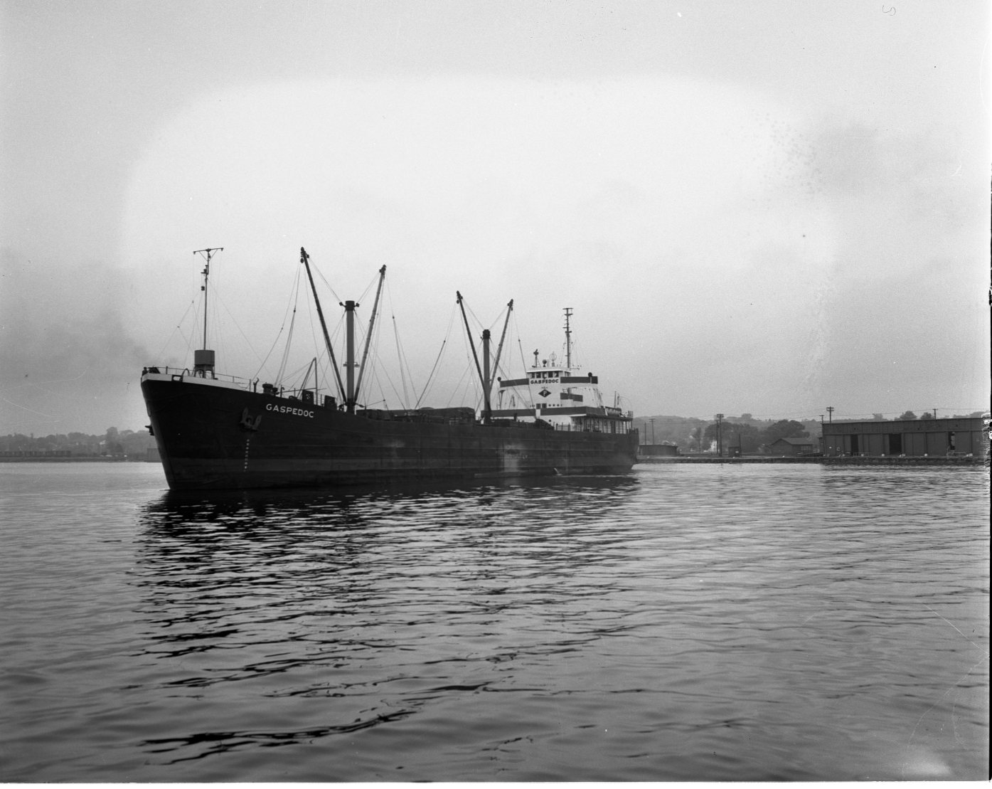 A ship which aroused unusual interest in Port yesterday was the Gaspedoc of the Paterson Sons Ltd. line. Now a stodgy freighter, it once had a much more-glamorous career as an LST (landing ship, tank) in the U.S. Navy. The ship, 316′ 5″ long, with 50 foot beam and 24.6 depth, was built at Galveston, Texas, during World War II. Big doors in the bow, where perhaps men and tanks poured out on to some distant war-time beach, are still visible, although welded closed. The Gaspedoc still has a square stem, too, for loading at the end, and twin screws.