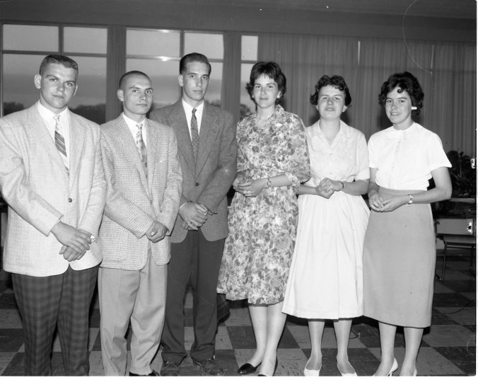 Tops among athletes are these boys and girls, who have scored at least 32 points in inter-school competitions to win coveted bars to their school letters. Left to right are Bill Binkley, Ron Marchildon, Doug Setterington, Elizabeth Cook, Anne Maher and Beverley Scott. Awards were made at recent athletic banquet held at the school.