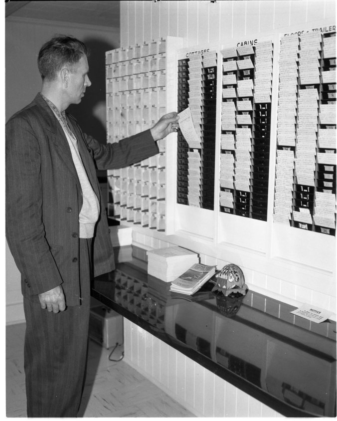 Another bumper season seems to be in prospect for Midland’s Little Lake tourist camp. Park Superintendent Harold McAllen, examines some of the registrations that already nearly fill the racks for cottages, cabins and tent or trailer spaces.