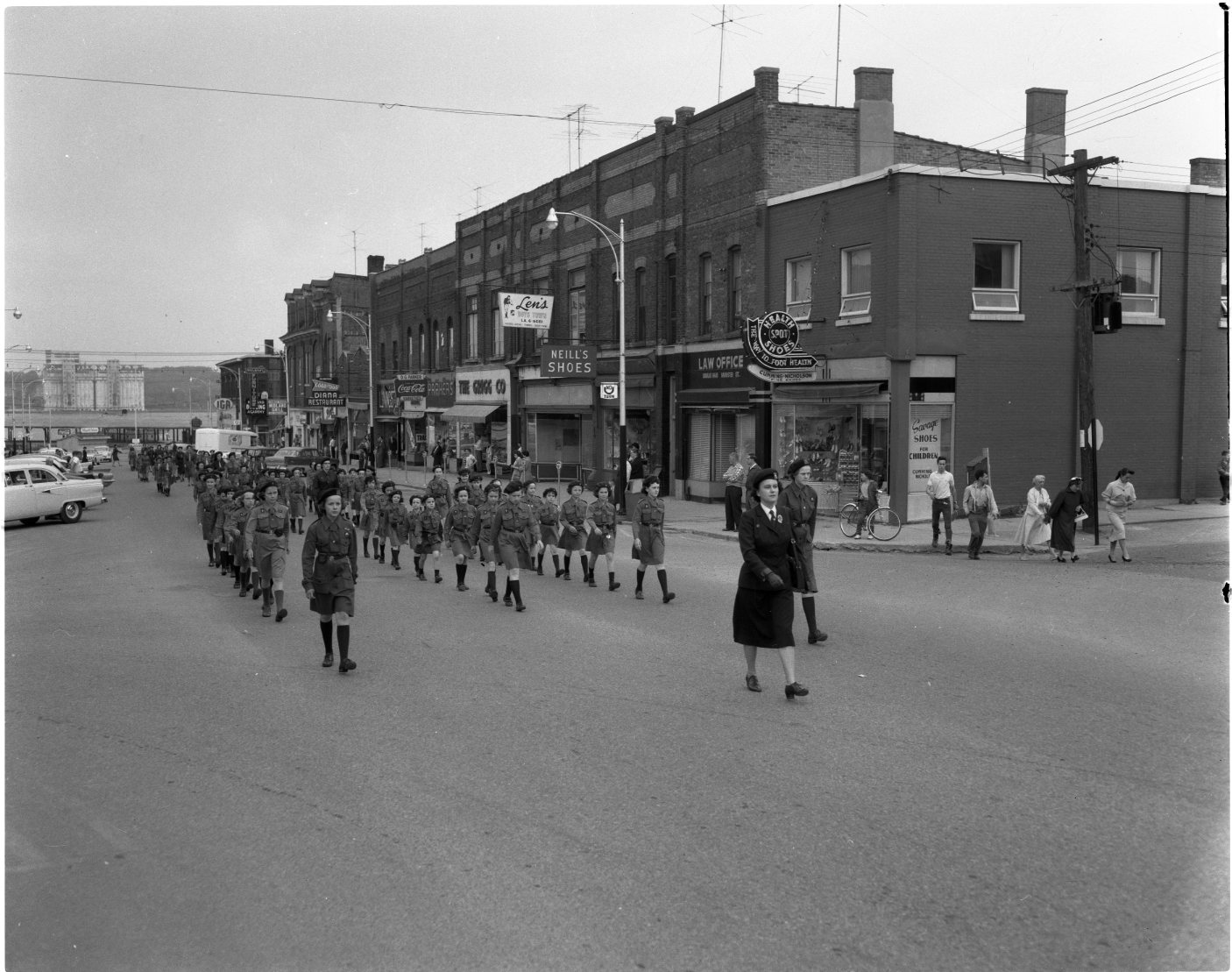 Midland Brownies and Guides step smartly along behind their leader Mrs. J. E. Lawlor, in the parade which preceded the monster rally of Guides and Brownies in Midland Saturday. Midland Citizens Band led the parade.