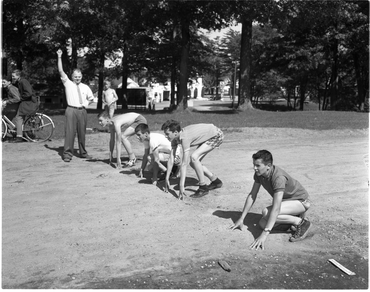 It will be “get set, on your marks, go,” in earnest for Midland public school athletes at the annual track and field meet to be held in Town Park this afternoon. Here the Parkview senior boys practice starts under watchful eye of Ken Cowan, Sixth Street principal. From front to back of picture boys are Jim Sharp, John Barbour, Garnet Rourke and Bill Argue.