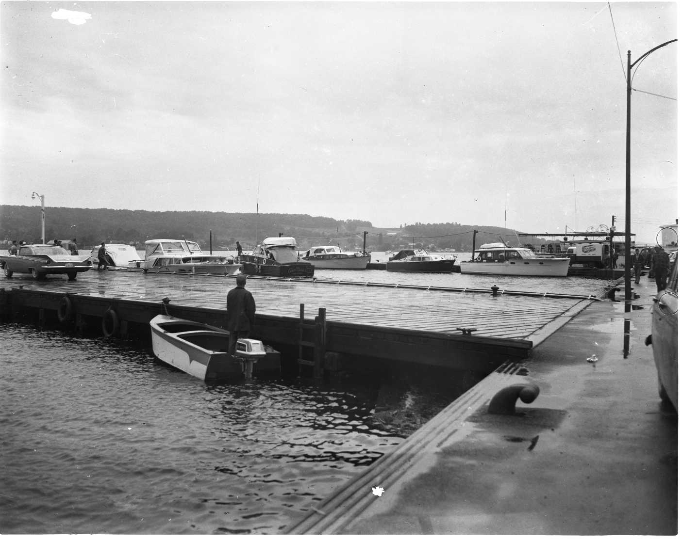 Outboard motor boat operator in foreground stands to watch as a group of seven pleasure cruisers tied up in Penetang Harbour Tuesday morning. Four were from Port Huron and the three others from Lake Simcoe Yacht Club at Keswick. Six craft can be seen in picture with seventh being hidden by the large boat in center.