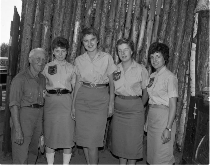These smiling faces daily greet visitors to Midland Y’s Men’s Indian village at Little Lake Park, rapidly becoming one of Ontario’s top tourist attractions. Lone chap at the left, who claims he “doesn’t stand a chance with all these girls”, is Jack Bridges. Girls are Faith Travers of Port McNicoll, Pat McConnell, London, Mary Mercer, Guelph, and Liz Ritchie, Fergus.